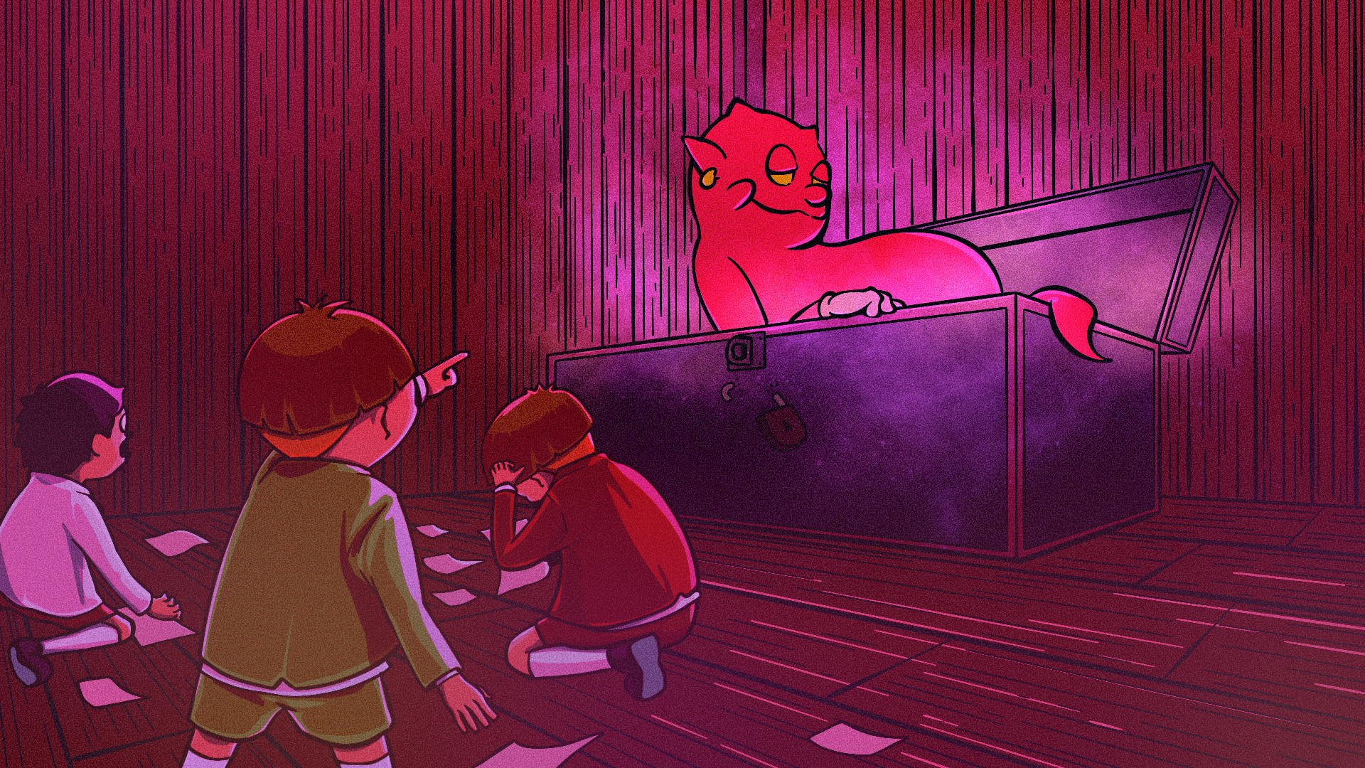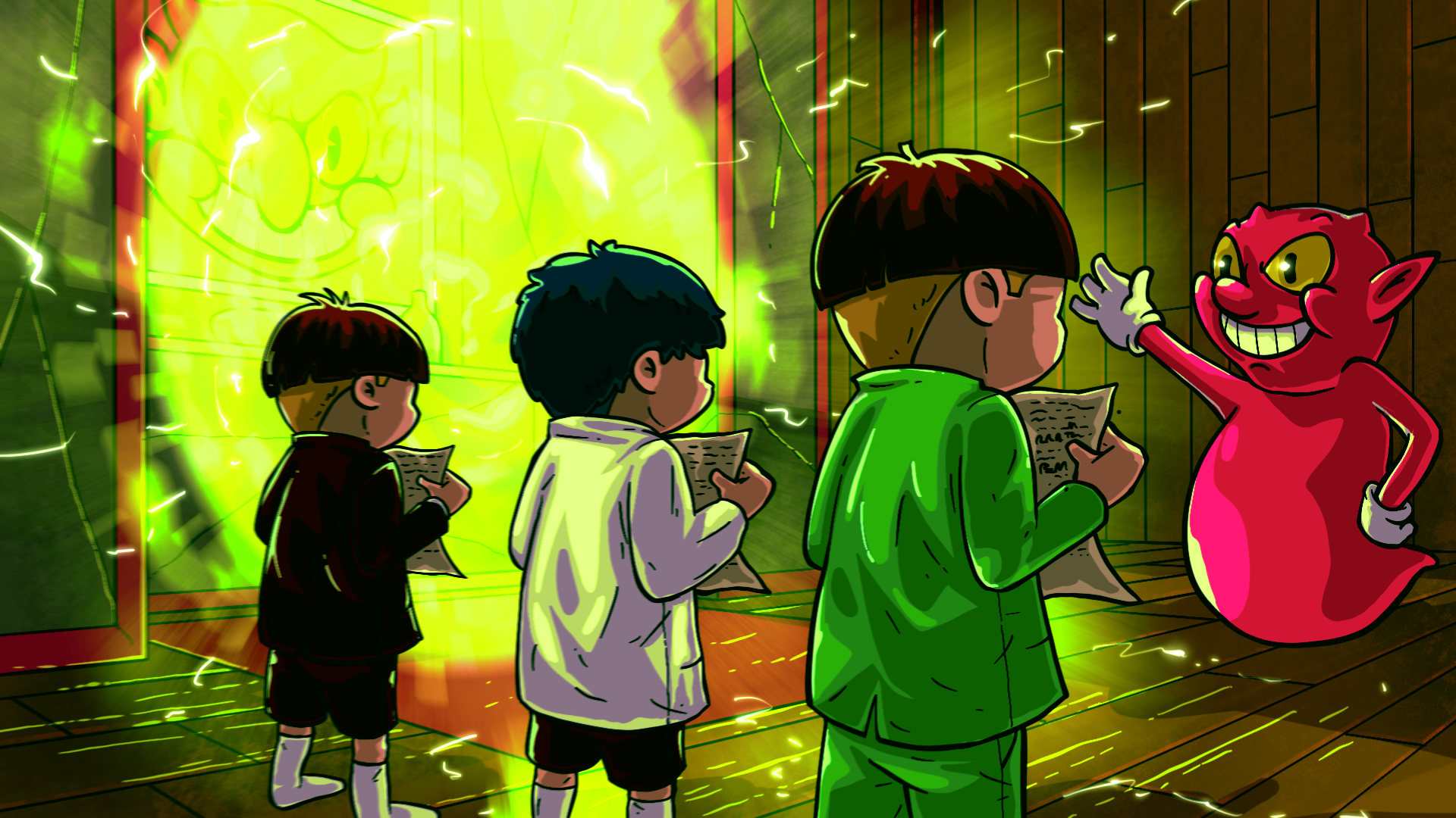 They pushed the creaking door open, stepping into the dark, house. Old papers littered the living room floor. One bore a strange chant with unreadable symbols. Bravely, one of them read it aloud. As the last words echoed, the air chilled, shadows swirled.