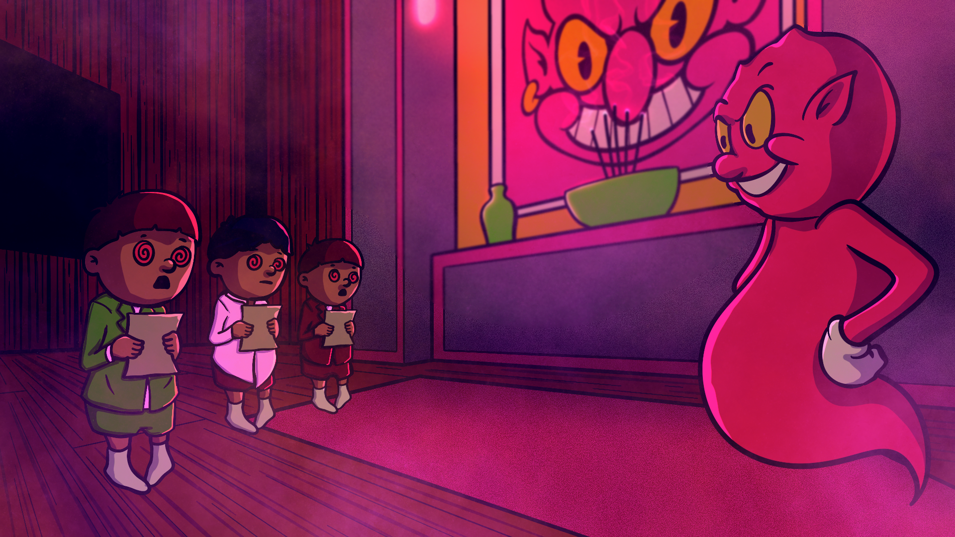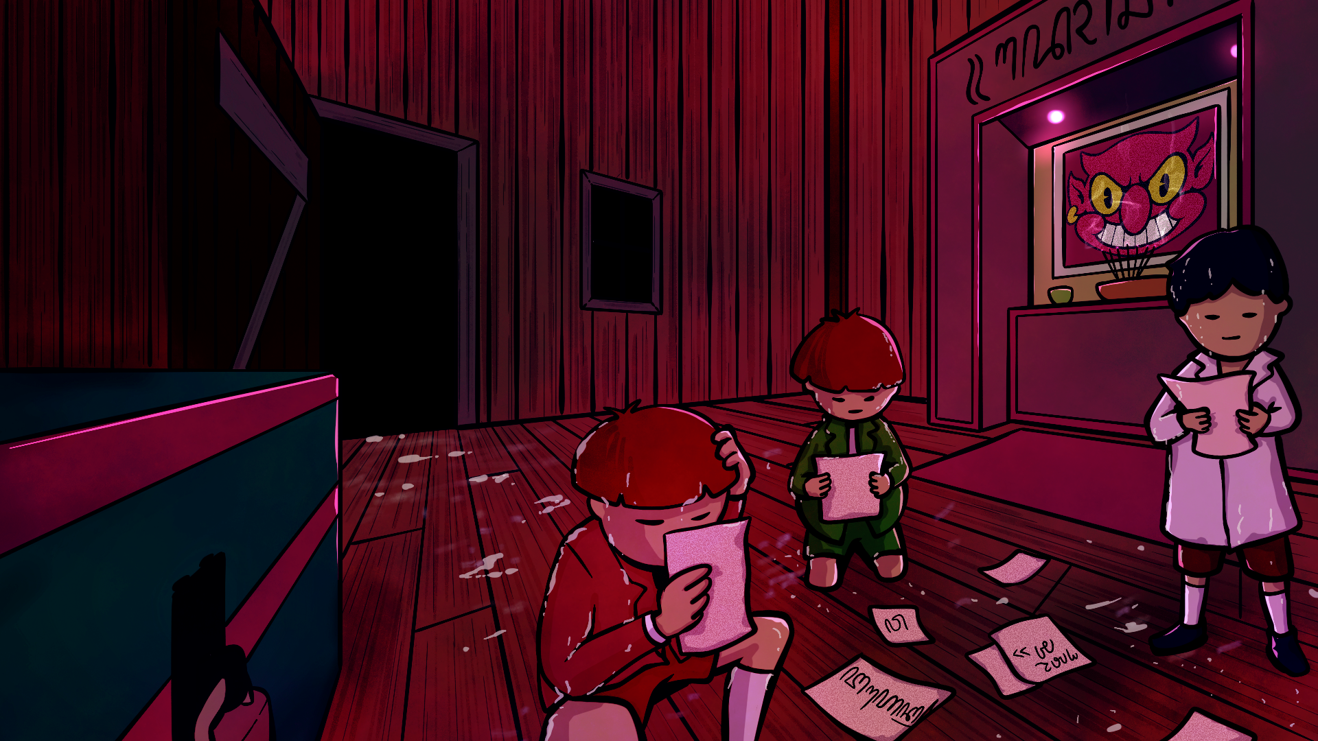 They pushed the creaking door open, stepping into the dark, house. Old papers littered the living room floor. One bore a strange chant with unreadable symbols. Bravely, one of them read it aloud. As the last words echoed, the air chilled, shadows swirled.