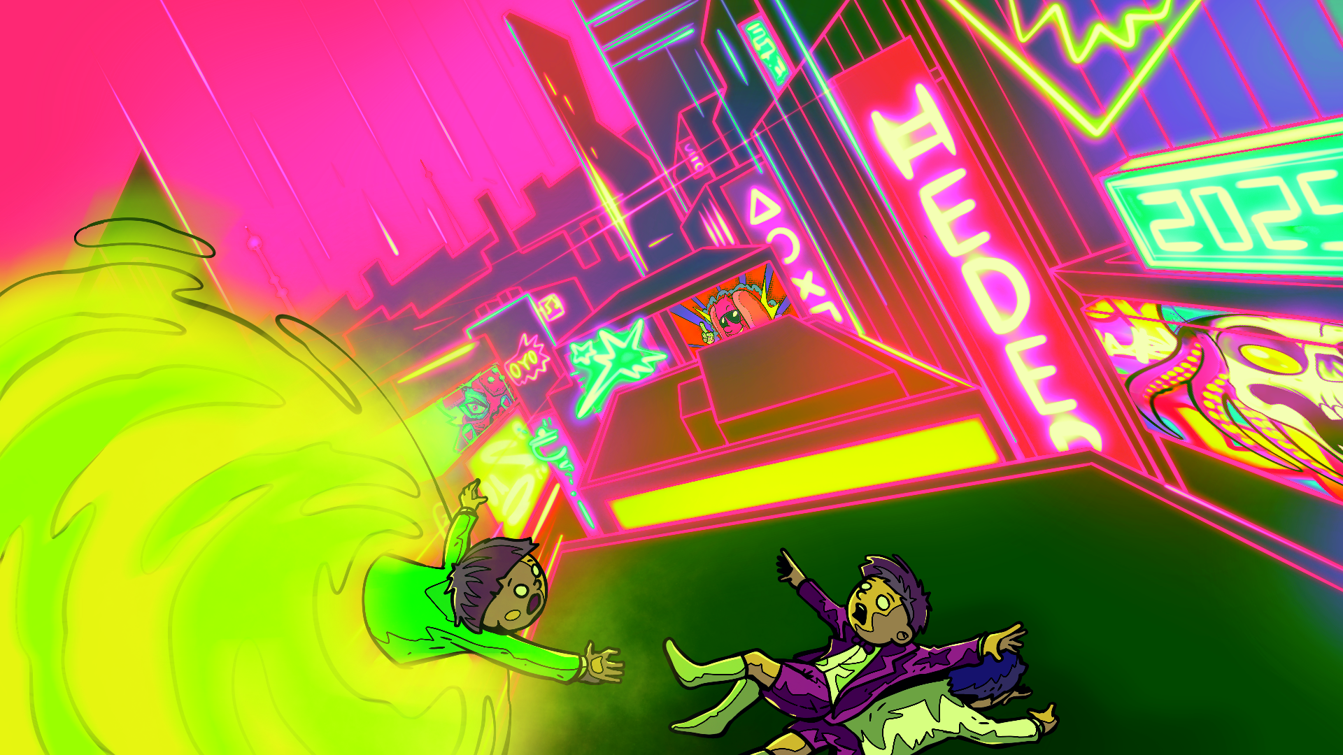 As they emerged from the portal, a futuristic neon-lit city unfolded. Symbols filled the air, billboards displayed NFTs, crypto, and blockchain concepts. Towering holographic buildings loomed, with ‘2025’ visible. Digital avatars replaced humans, each radiating unique energy.