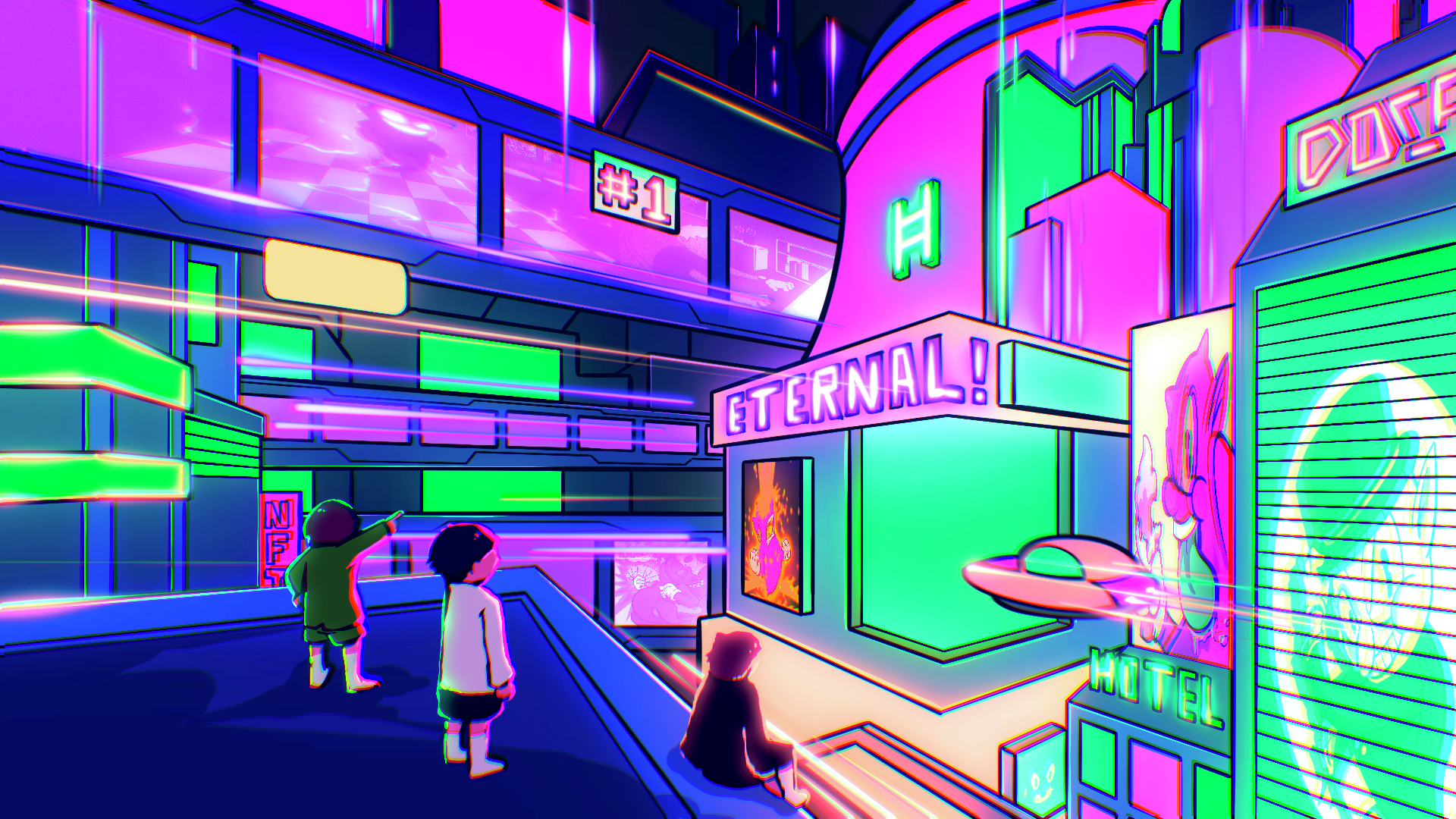 The vibrant city unfolded before them. A massive “Flamzle” logo gleamed as a voice echoed: “Welcome to your new world, a place where courage and creation thrive.” Guided by Flamzle, they explored NFTs, digital art, and streets alive with endless potential. This was just the beginning..